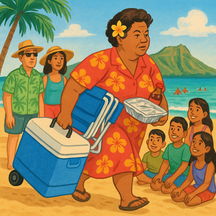 But it’s not about showing off. It’s about taking care. That’s the root of it. Auntie’s cooler is a symbol of aloha in action — nourishment, comfort, protection, hospitality. The spam musubi isn’t just food; it’s love wrapped in seaweed. The backup towel? That’s her way of saying, “I got you.” The Costco-size pack of utensils? Proof she expects everyone to bring their cousins and their cousin’s dog too.